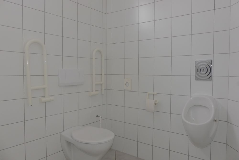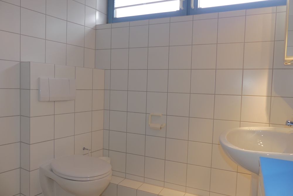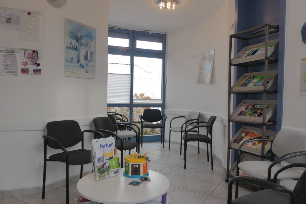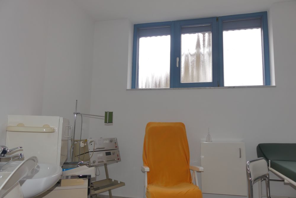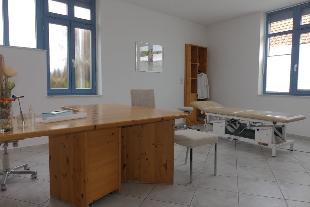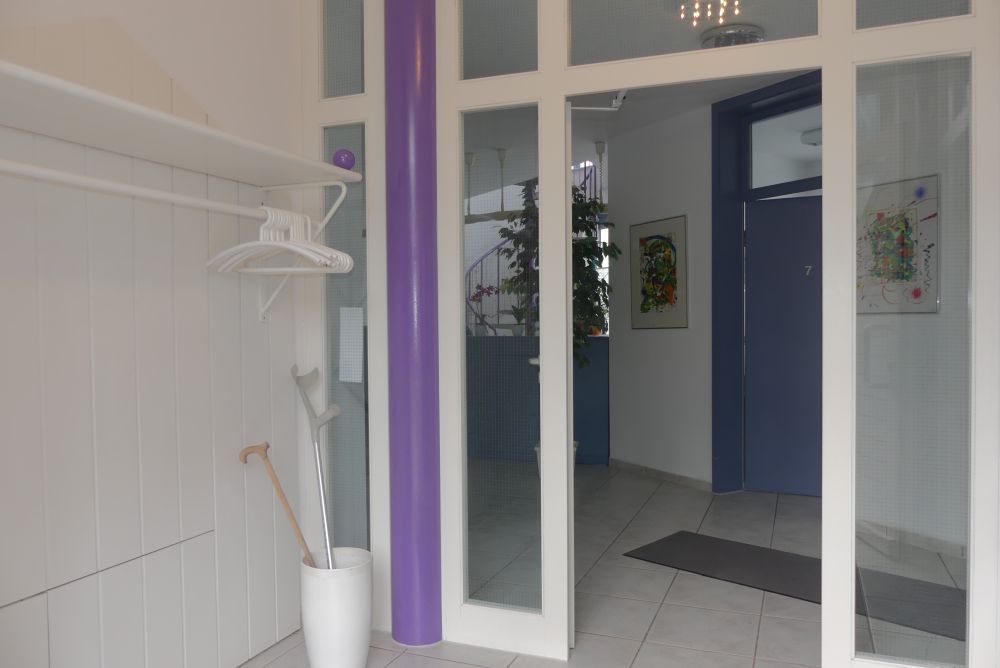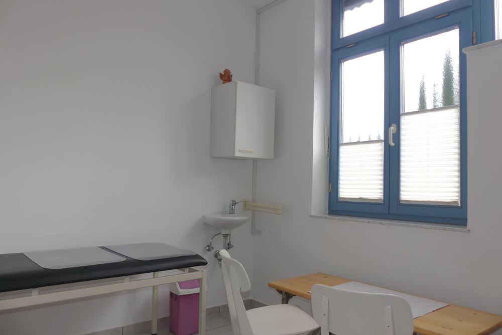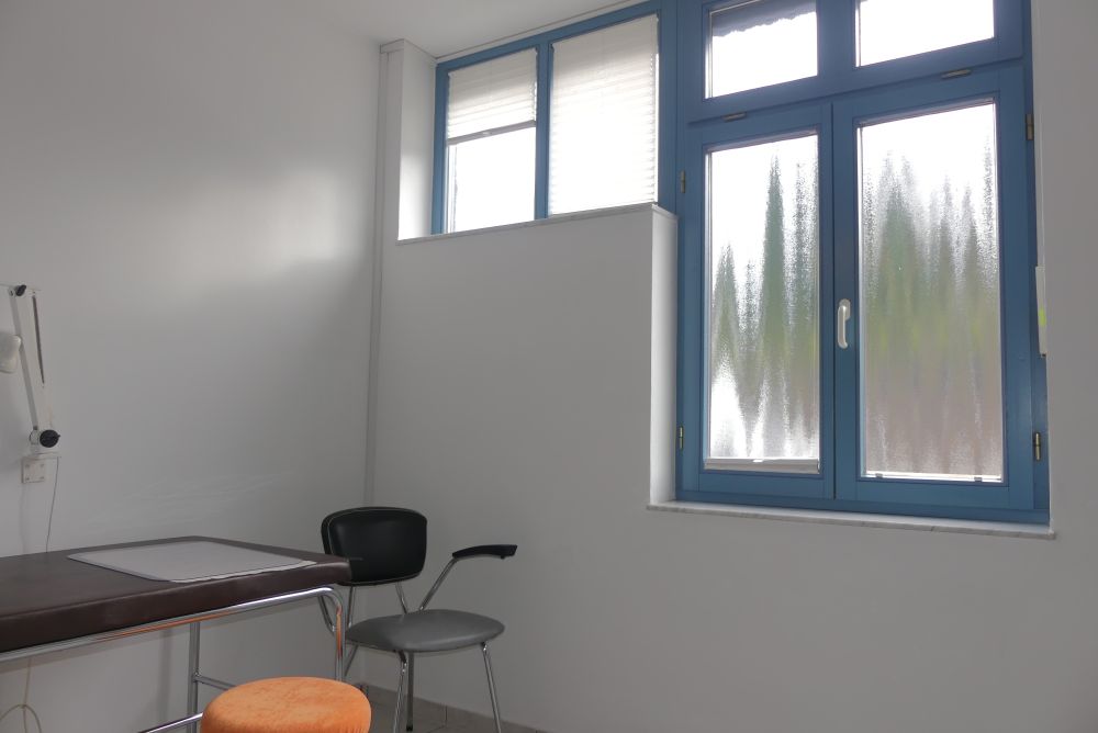 Der Zugang im Erdgeschoss erfolgt über einen kleinen Windfang mit einer Garderobe, der in die Eingangshalle mit Empfangsbereich führt. Die Räumlichkeiten umfassen ein Arztzimmer, ein Büroraum, fünf Nebenräume, ein Wartezimmer, ein WC, ein Abstellraum, ein Heizungsraum und einen Öltankraum.